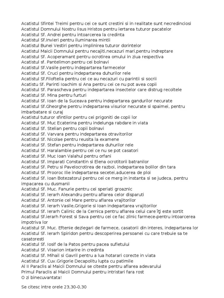 Acatiste ale tuturor sfintilor, acatiste ale maicii domnului, acatiste ale sfintei treimi, acatiste ale ingerului pazitor Acatistele se citesc timp de 40 de zile și trebuie însoțite de spovedanie,. 3 +++ rugăciune după sfârşitul lucrului. Acatiste ale tuturor sfintilor, acatiste ale maicii domnului, acatiste ale sfintei treimi, acatiste ale ingerului pazitor Acatistul pentru vindecarea de cancer, către icoana maicii domnului „pantanassa" acatist către maica domnului, pentru izbăvirea de patima beției, înaintea icoanei „potirul nesecat" rugăciune către maica domnului pentru vindecarea de boli Pentru persoanele ce nu pot avea copii, acatistul sfinților părinți ioachim și ana citit vreme de 40 de zile, cu post și fapte bune, poate face minuni.