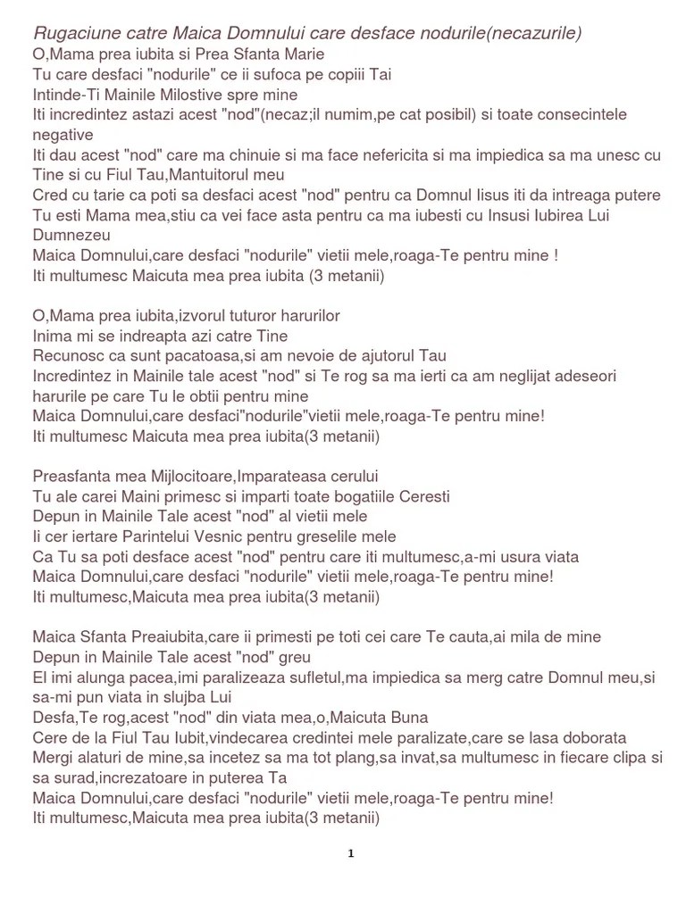 O, mamă prea iubită şi preasfântă fecioară maria, tu care desfaci "nodurile" ce îi sufocă pe copiii tăi,... Se spune despre rugaciunea catre maica domnului ca este una dintre cele mai puternice rugaciuni facatoare de minuni. Îţi mulţumesc, măicuţa mea prea iubită (3 metanii) maică sfântă preaiubită, care îi primeşti pe toţi cei care te caută, ai milă de mine Rugăciune grabnic ajutătoare, primită de la sfânta mănăstire. Iti incredintez astazi acest "nod" (numim necazul) si toate consecintele negative.
